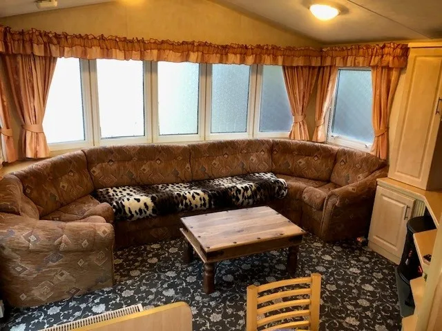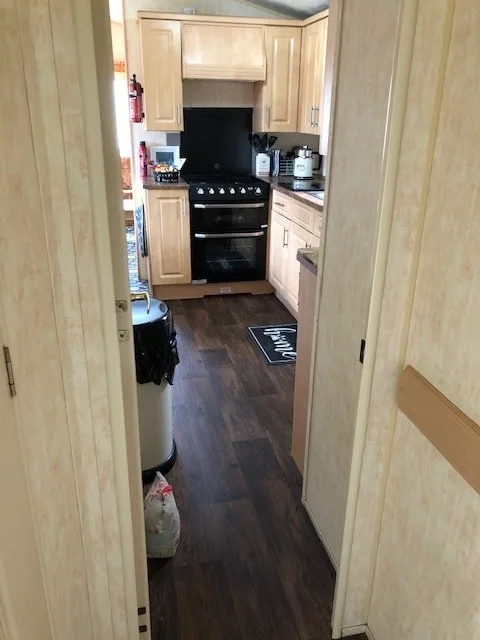 Gas oven/hob, microwave, 4 slot toaster, fridge. Practical wood-effect vinyl flooring. Radiator.